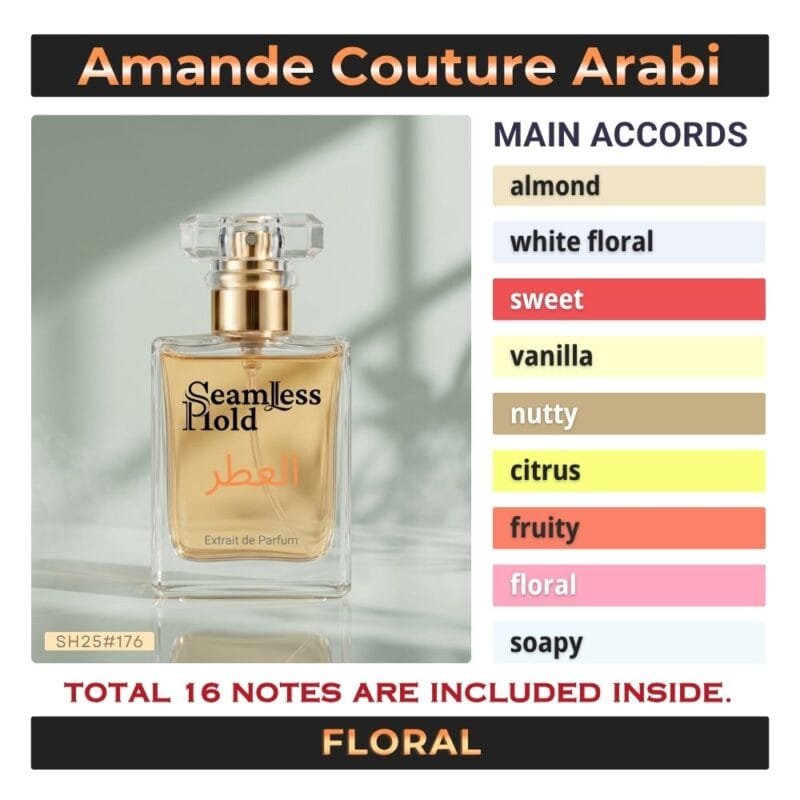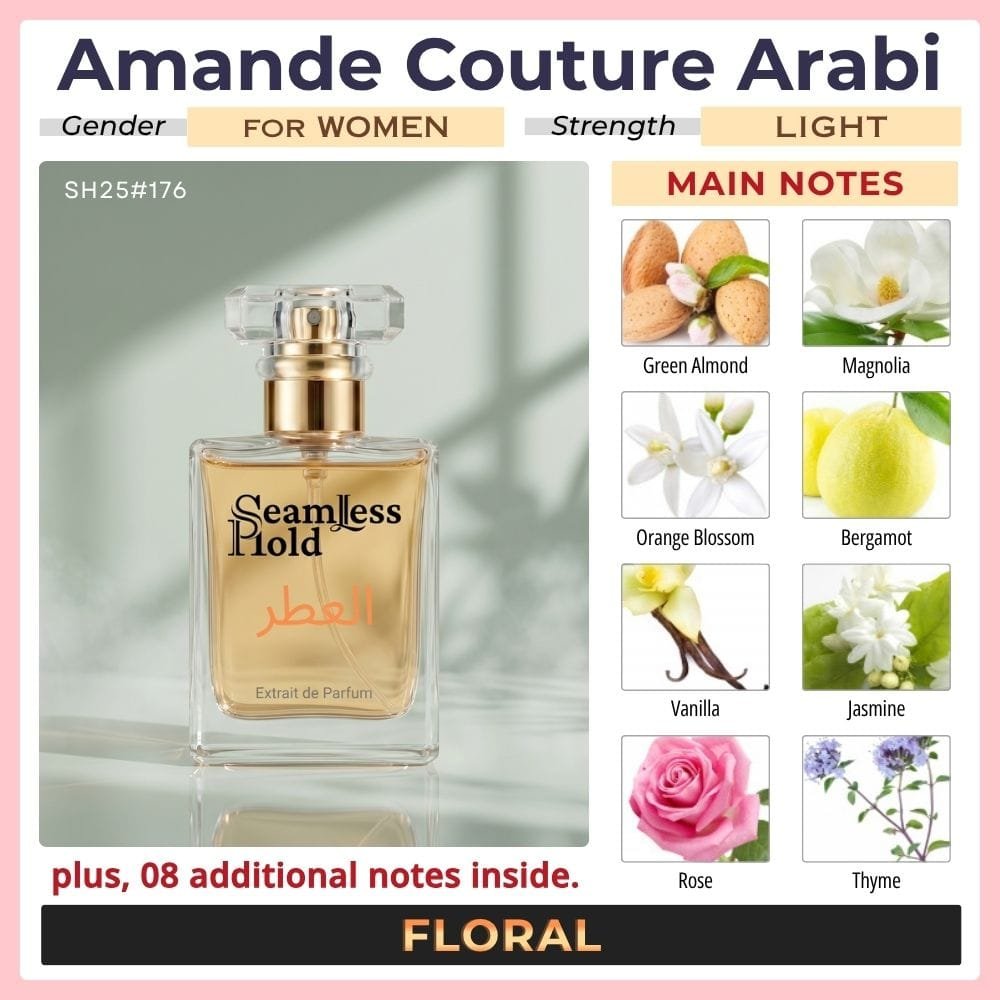 Seamless Hold Amande Couture Arabi is an elegant almond orange blossom vanilla perfume for women, created for those who love soft sophistication with a luminous, feminine finish. It opens with magnolia and Calabrian bergamot for a bright, graceful first impression that feels airy, polished, and fresh. At the heart, orange blossom blooms with a delicate floral glow that feels refined and beautifully feminine. As it settles, green almond and vanilla create a smooth, creamy trail that feels soft, addictive, and luxuriously long-lasting. This scent direction closely matches the accord profile and note pyramid.