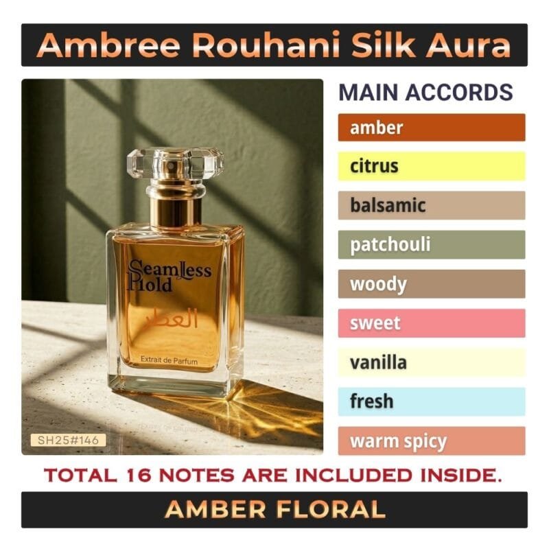 Seamless Hold Ambree Rouhani Silk Aura is a smooth amber rose patchouli perfume for women, created for those who love soft elegance with warm depth. It opens with luminous citrus and Amalfi lemon for a fresh, refined first impression that feels clean, bright, and graceful. At the heart, rose and patchouli bloom together in a way that feels feminine, polished, and gently sensual. As it settles, amber, opoponax, and vanilla create a silky balsamic trail that feels warm, comforting, and beautifully luxurious. That scent direction closely matches the accord profile and note pyramid.