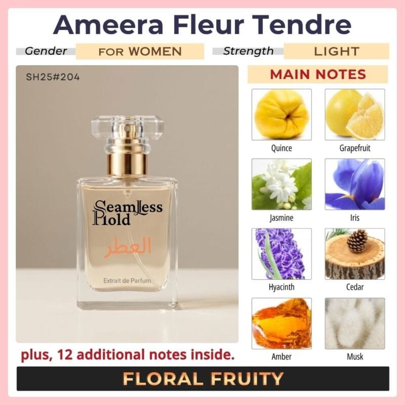 Seamless Hold Ameera Fleur Tendre is a radiant quince grapefruit floral musk perfume for women, created for those who love soft freshness with a delicate, elegant finish. It opens with juicy quince and sparkling grapefruit for a bright first impression that feels crisp, feminine, and effortlessly charming. At the heart, hyacinth and jasmine bloom into a graceful floral aura that feels airy, romantic, and beautifully refined. As it settles, musk, iris, Virginia cedar, and amber create a soft velvety trail that feels smooth, clean, and beautifully long-lasting. This scent direction closely matches the accord profile and note pyramid.