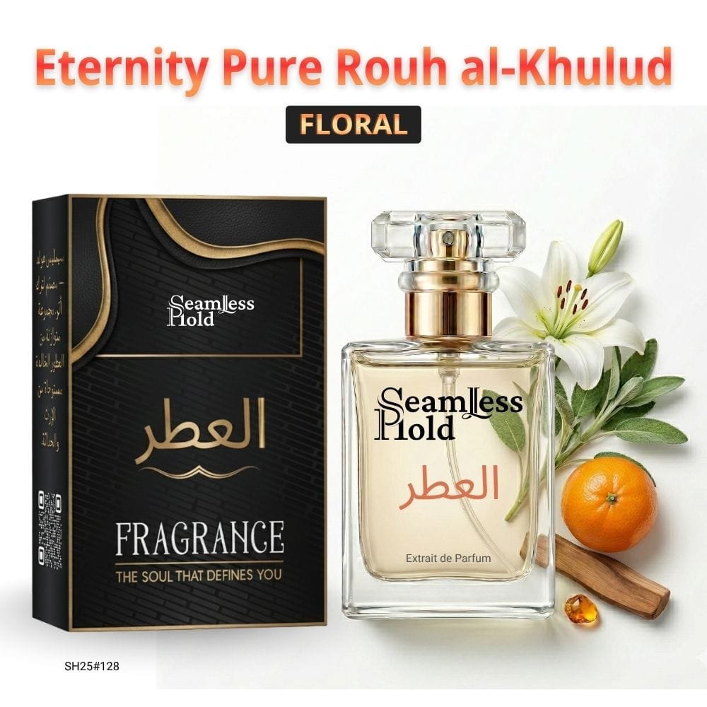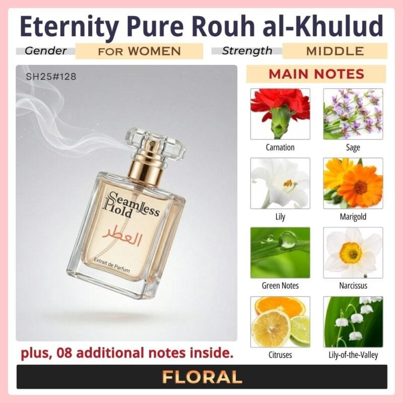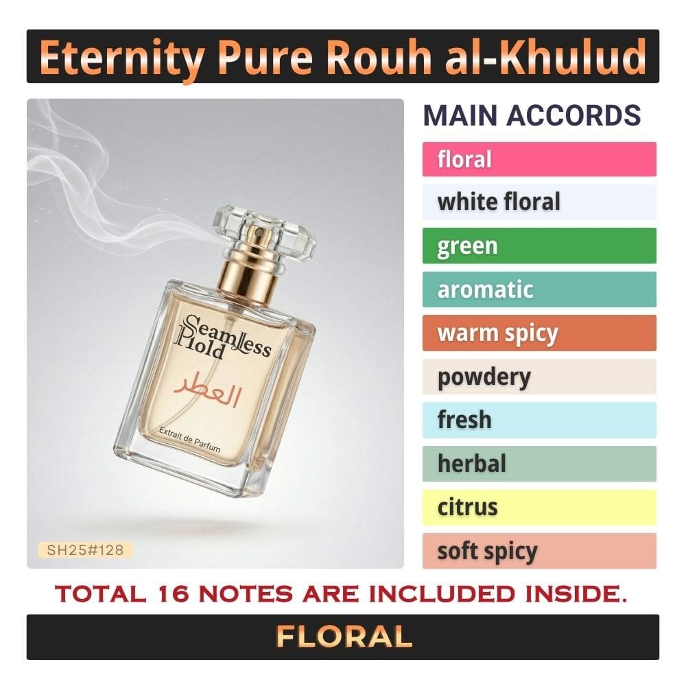 Seamless Hold Eternity Pure Rouh al-Khulud is a graceful floral green perfume for women, created for those who love fresh elegance with a timeless feminine finish. It opens with crisp green notes, freesia, sage, citrus, and mandarin orange for a bright, airy first impression that feels clean and uplifting. At the heart, carnation, lily, lily-of-the-valley, narcissus, marigold, violet, rose, and jasmine bloom into a soft floral bouquet that feels classic, polished, and beautifully feminine. As it settles, musk, heliotrope, sandalwood, amber, and patchouli leave a smooth, powdery, lightly woody trail that feels comforting, refined, and long-lasting. That scent direction is strongly supported by the accord profile and note pyramid.
