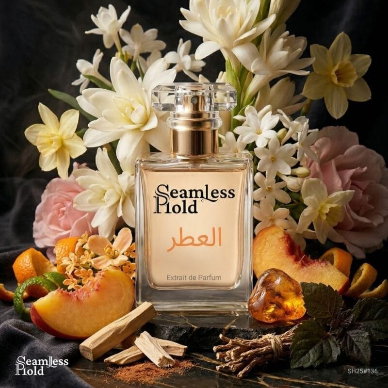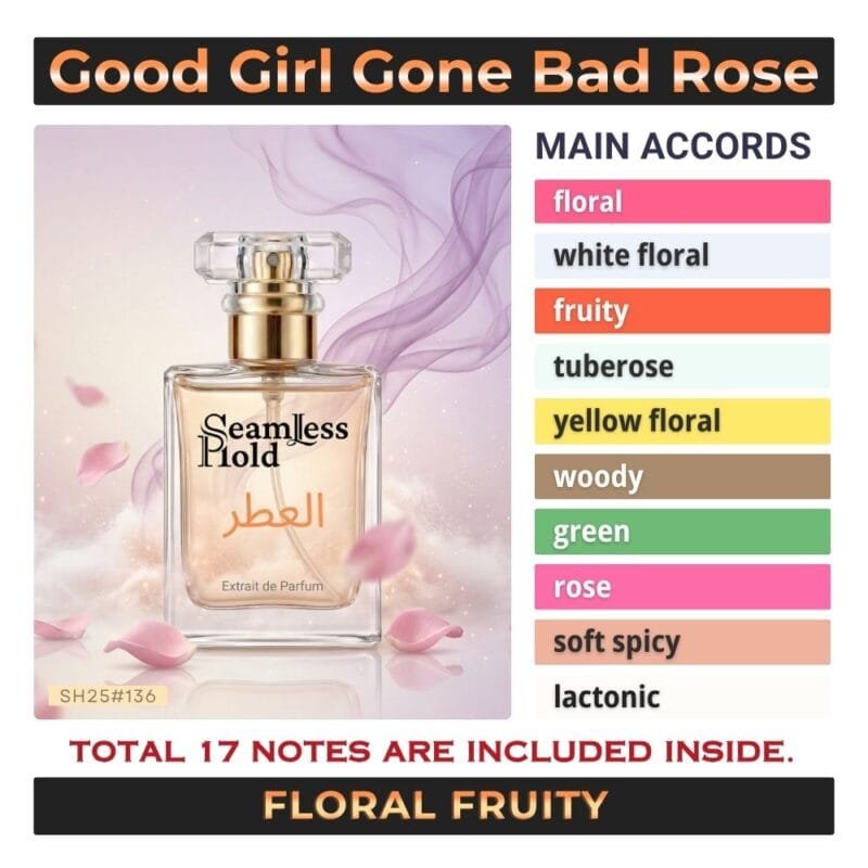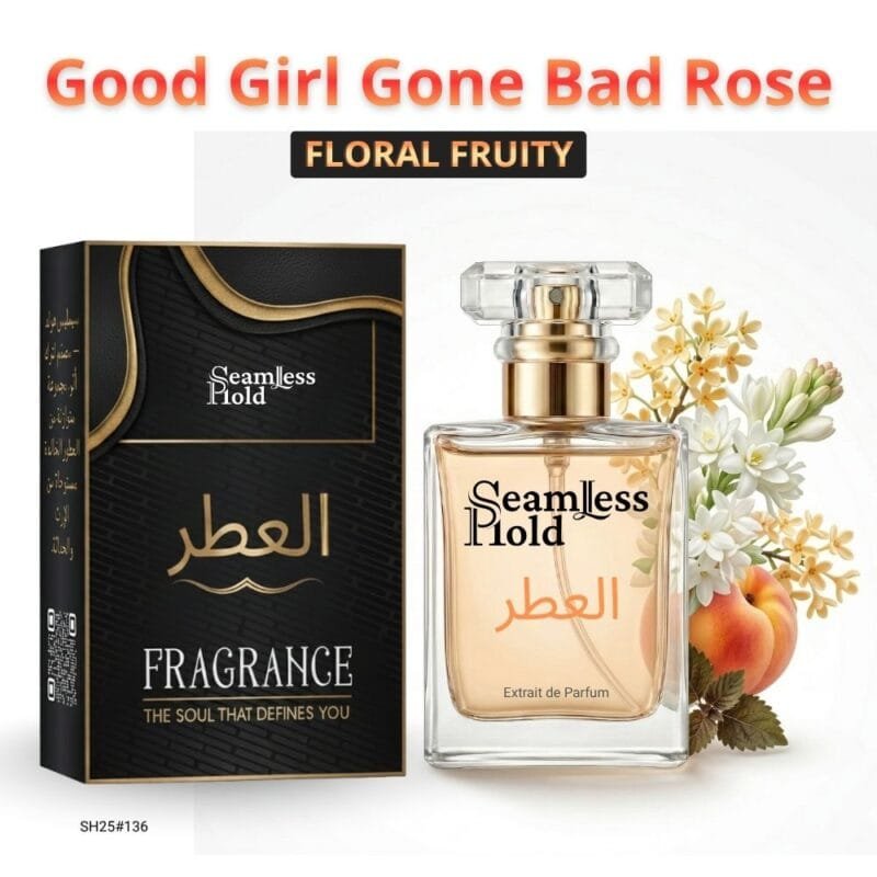 Seamless Hold Good Girl Gone Bad Rose is a lush white floral fruity perfume for women, created for those who love bold femininity with a sensual, luxurious finish. It opens with glowing osmanthus, juicy peach, neroli, bergamot, mandarin, and a soft touch of cinnamon for a bright, addictive first impression that feels playful yet sophisticated. At the heart, Indian tuberose, jasmine, narcissus, and May rose bloom into a rich floral aura that feels creamy, seductive, and unforgettable. As it settles, amber, cedar, sandalwood, vetiver, and patchouli create a warm woody trail that feels smooth, elegant, and beautifully long-lasting. That scent direction closely matches the accord profile and note pyramid.