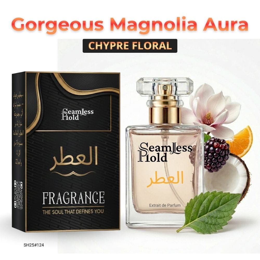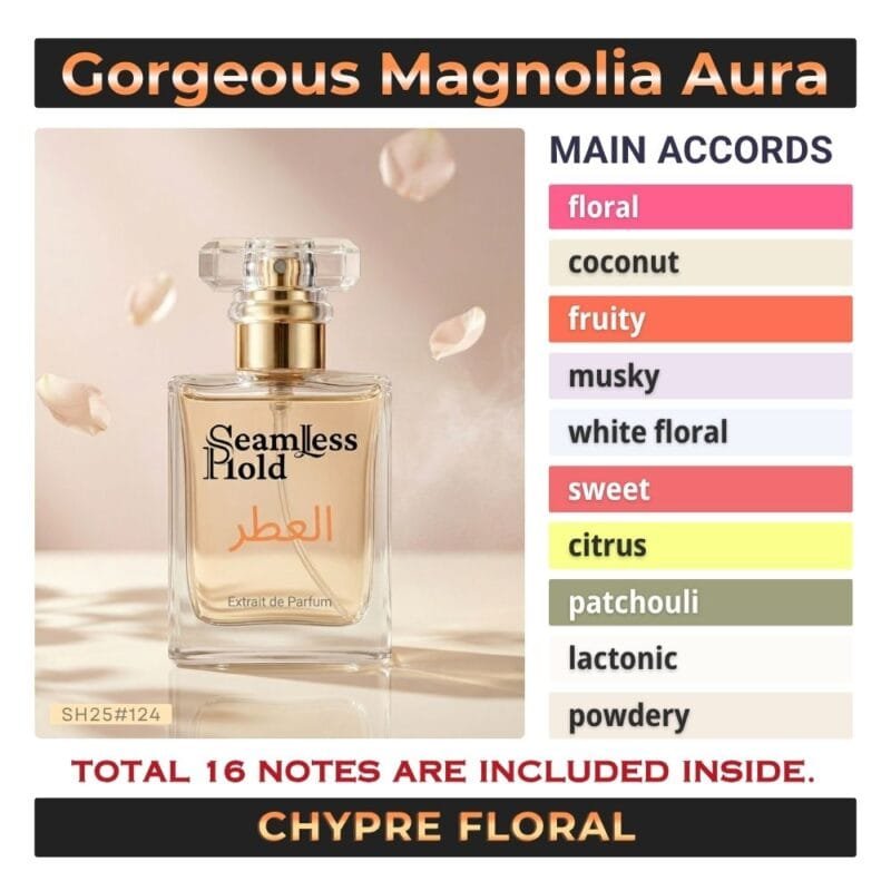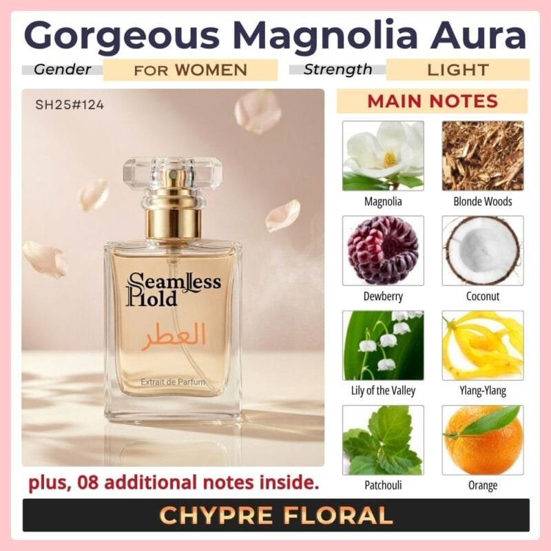 Seamless Hold Gorgeous Magnolia Aura is a radiant floral coconut white floral perfume for women, created for those who love soft sweetness wrapped in confident elegance. It opens with juicy dewberry, creamy coconut, and bright orange for a fresh, uplifting first impression that feels playful and luxurious. At the heart, magnolia blooms with jasmine sambac, ylang-ylang, and lily of the valley, creating a feminine floral aura that feels luminous, graceful, and beautifully modern. As it settles, musk, patchouli, and blonde woods leave a smooth, sensual trail that feels soft, polished, and unforgettable. That scent direction closely matches the accord profile and note pyramid.
