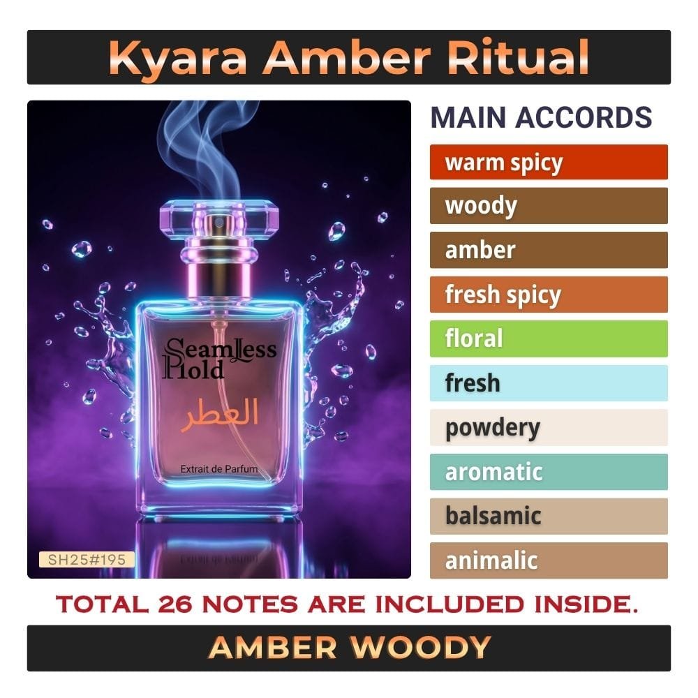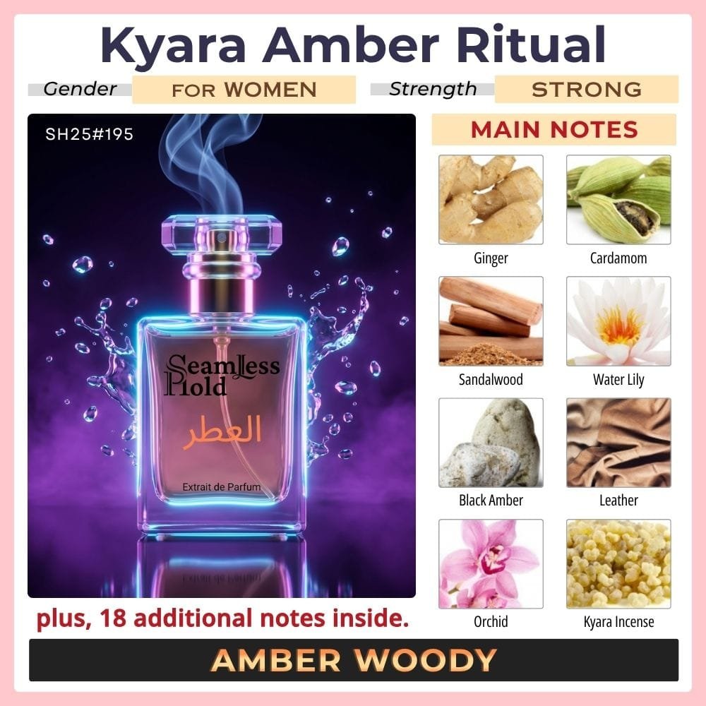 Seamless Hold Kyara Amber Ritual is a bold spicy amber incense perfume for women, created for those who love dark elegance with a smooth, exotic finish. It opens with black cardamom, ginger, and pink pepper for a rich spicy first impression that feels warm, refined, and instantly captivating. At the heart, jasmine, orchid, water lily, and rose add a soft floral glow that keeps the scent graceful and feminine. As it settles, leather, sandalwood, kyara incense, patchouli, and black amber create a deep, smoky-woody trail that feels mysterious, luxurious, and beautifully long-lasting. This scent direction closely matches the accord note pyramid and oriental-woody profile.