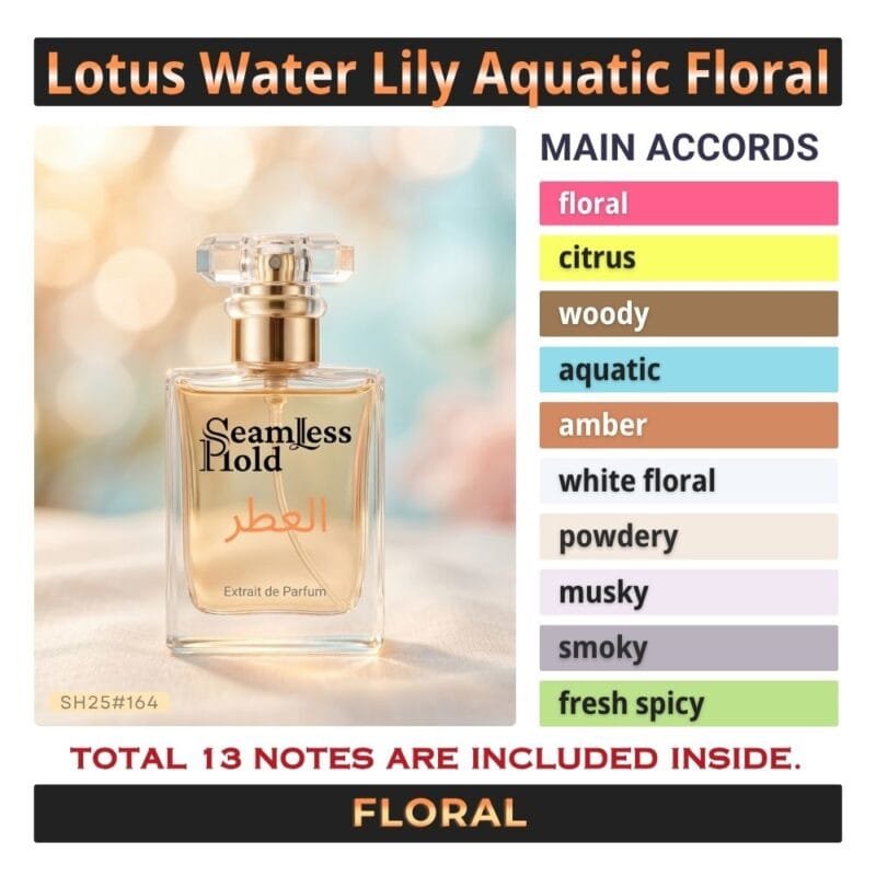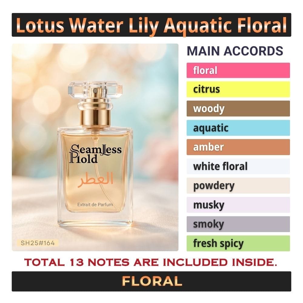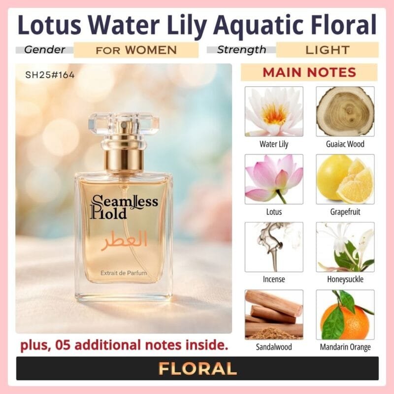 Seamless Hold Lotus Water Lily Aquatic Floral is a fresh aquatic floral perfume for women, created for those who love clean elegance with a soft luminous finish. It opens with sparkling grapefruit, bergamot, and mandarin orange for a bright, uplifting first impression that feels crisp, airy, and beautifully refreshing. At the heart, lotus, water lily, honeysuckle, freesia, and jasmine bloom into a watery floral aura that feels graceful, feminine, and serene. As it settles, musk, guaiac wood, incense, amber, and sandalwood create a smooth woody-musky trail that feels soft, refined, and beautifully long-lasting. That scent direction closely matches the accord profile and note pyramid.