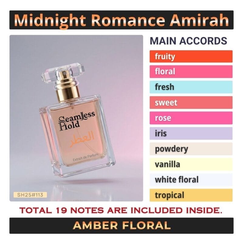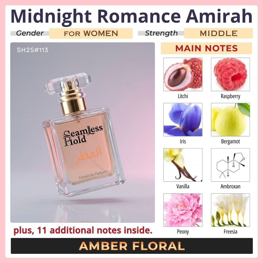 Seamless Hold Midnight Romance Amirah is a sensual fruity floral vanilla perfume for women, created for those who love romantic sweetness with a polished, feminine finish. It opens with juicy raspberry, luminous litchi, and sparkling bergamot for a bright, addictive first impression. At the heart, peony, freesia, and jasmine sambac bloom into a soft floral aura that feels elegant, graceful, and beautifully romantic. As it settles, iris, vanilla, and ambroxan create a smooth, velvety trail that feels warm, softly powdery, and irresistibly feminine. That scent direction closely matches the accord profile and note pyramid.
