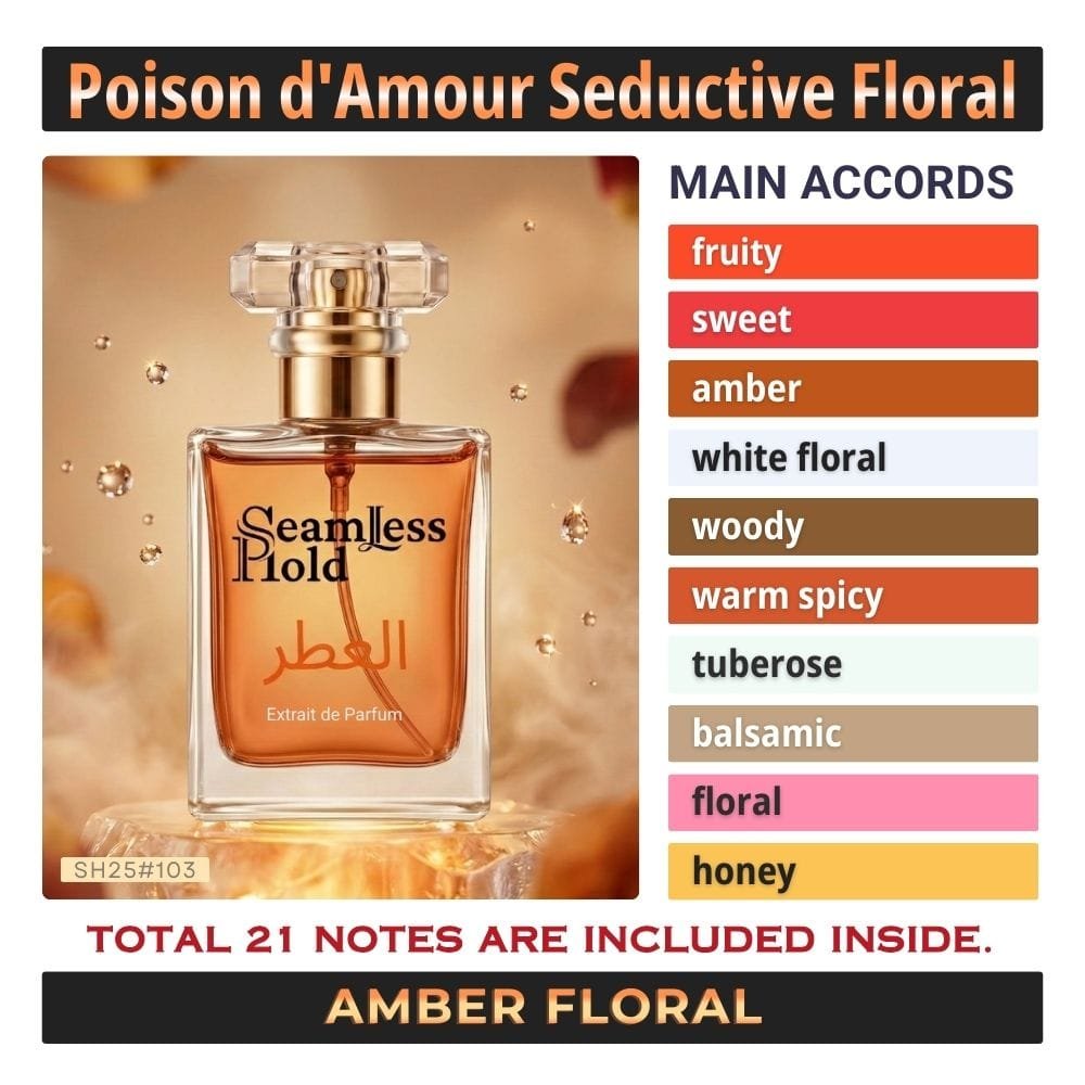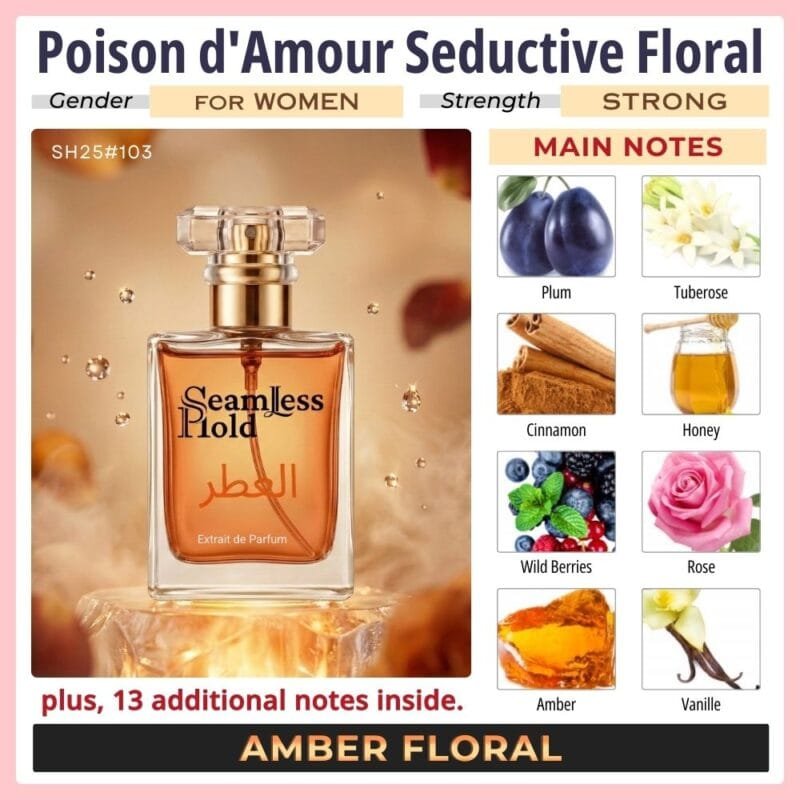 Seamless Hold Poison d’Amour is a bold, seductive floral perfume made for women who love rich, mysterious, unforgettable scents. This luxurious blend opens with dark juicy fruit and soft spice, blooms into an opulent white-floral heart, and melts into a warm base of amber, creamy woods, vanilla sweetness, and sensual musk. Its scent direction aligns with a dark fruity-floral structure built around plum, wild berries, tuberose, incense, honeyed warmth, cinnamon, vanilla, amber, sandalwood, and musk.