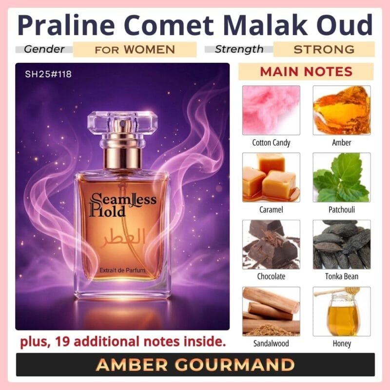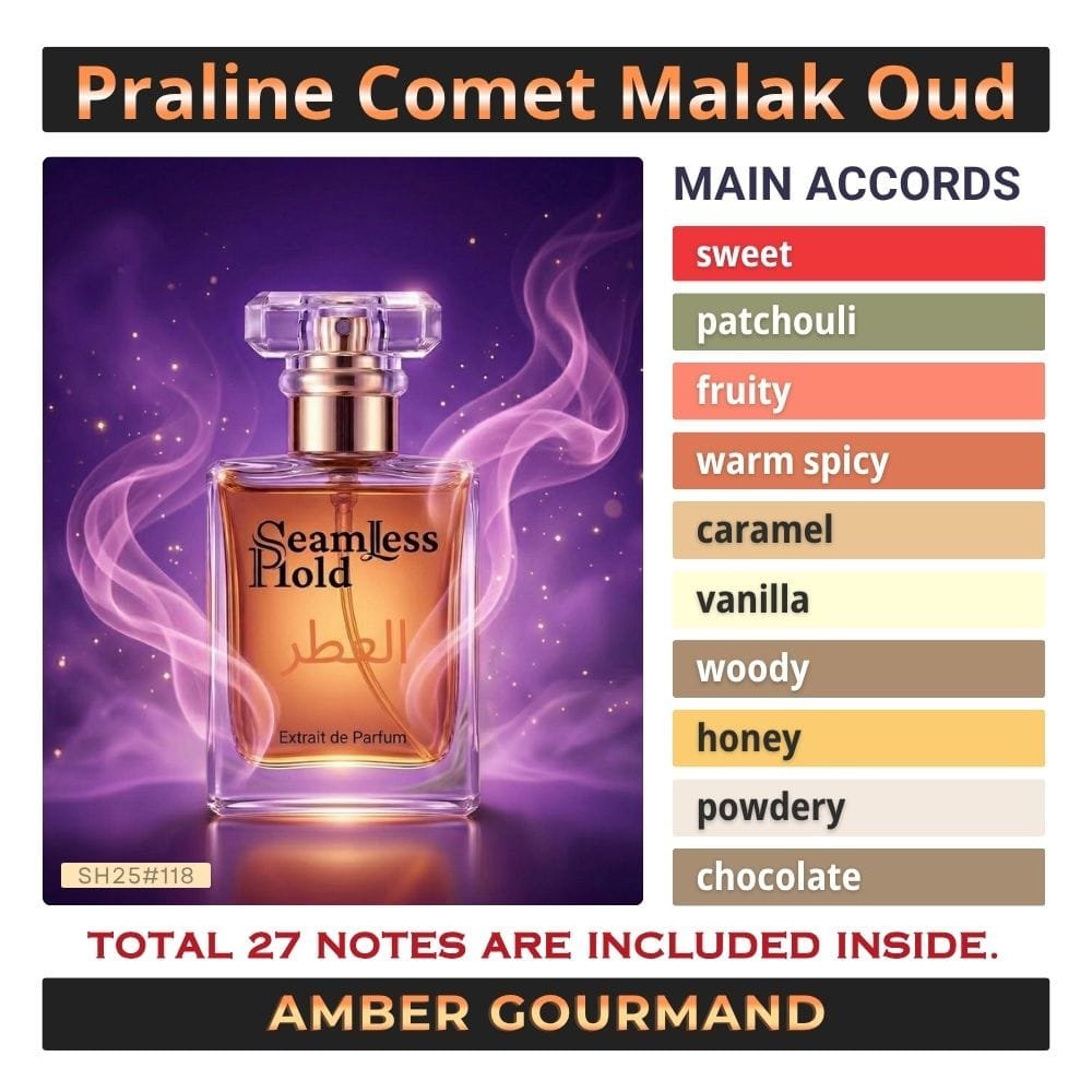Seamless Hold Praline Comet Malak Oud is a bold sweet patchouli chocolate vanilla perfume for women, created for those who love rich gourmand glamour with deep sensual warmth. It opens with a dazzling burst of cotton candy, coconut, cassis, melon, pineapple, mandarin orange, bergamot, and jasmine, creating a juicy, sparkling first impression that feels playful yet luxurious. As it unfolds, honey, red berries, blackberry, plum, apricot, peach, orchid, rose, lily-of-the-valley, nutmeg, and caraway add a lush fruity-floral heart with golden warmth and soft spice. The dry down is where the magic deepens, settling into an irresistible trail of patchouli, chocolate, caramel, vanilla, tonka bean, amber, musk, and sandalwood for a rich, velvety finish that feels indulgent, powerful, and unforgettable. It is classified as an Oriental Vanilla fragrance for women and lists those accords and notes.