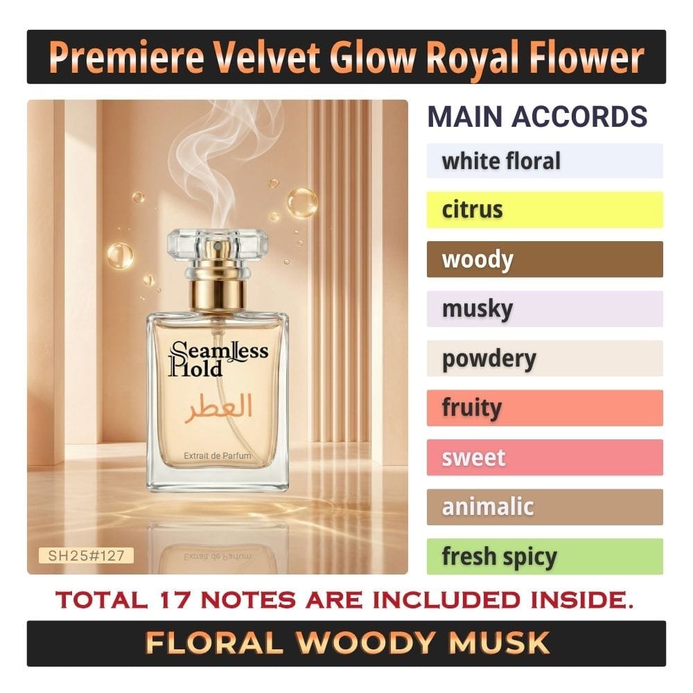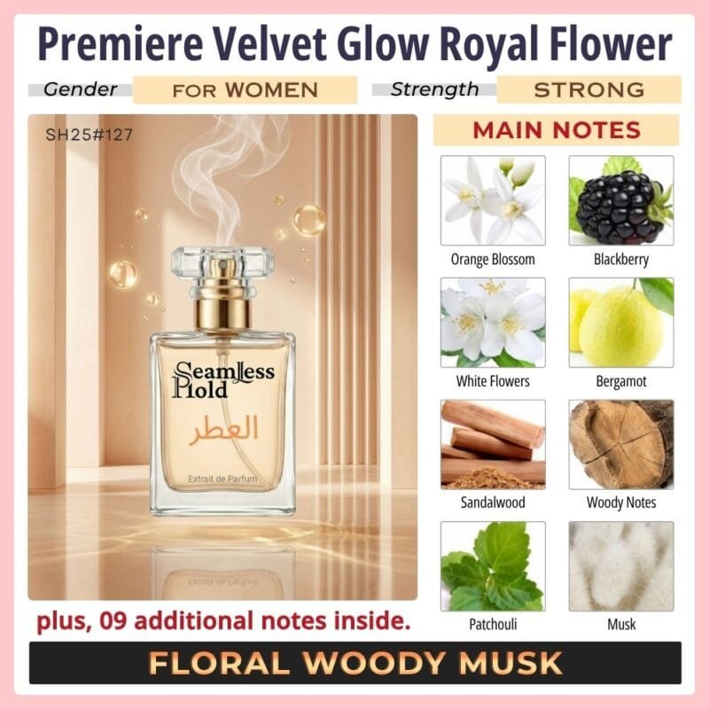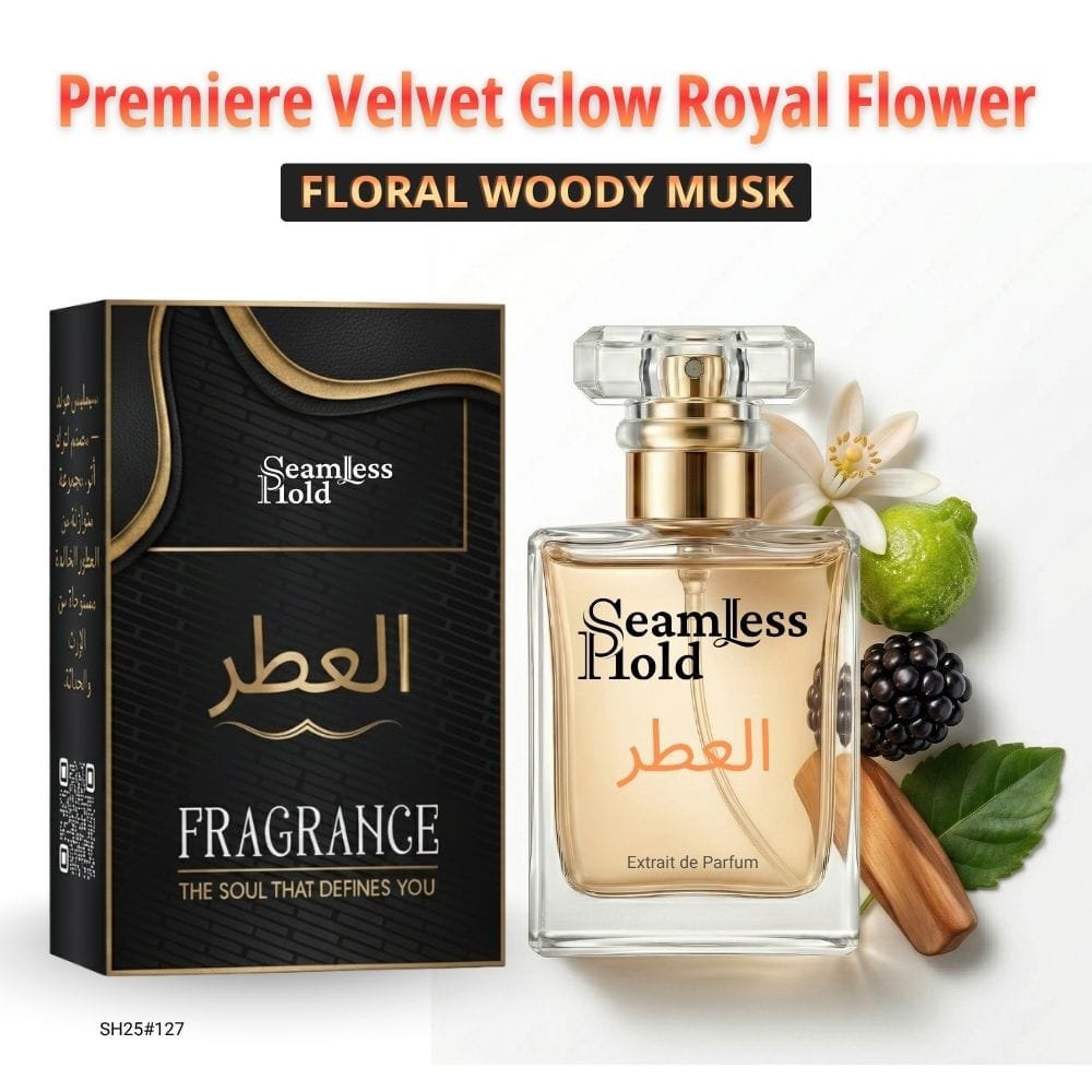Seamless Hold Premiere Velvet Glow Royal Flower is a white floral citrus musk perfume for women with sparkling bergamot, juicy blackberry, luminous white flowers, orange blossom, soft musk, warm sandalwood, woody notes, and elegant patchouli. Smooth, feminine, and beautifully polished, it delivers a glamorous floral glow with a warm refined finish that feels luxurious from day to night. Its profile aligns with the white-floral, citrus, woody, musky, powdery, fruity, sweet, and softly spicy style.