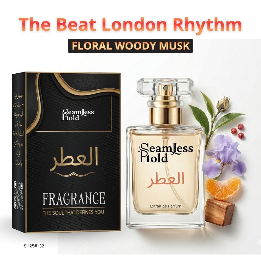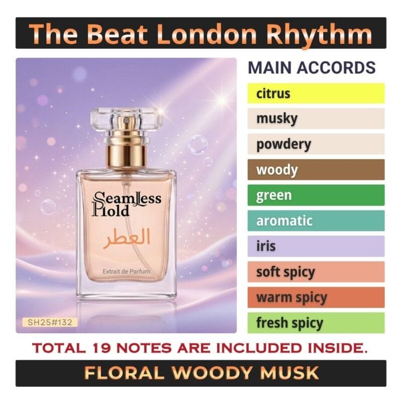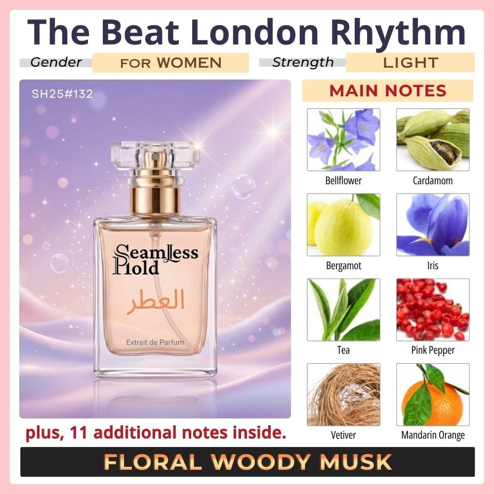 Seamless Hold The Beat London Rhythm is a fresh citrus musky tea perfume for women, created for those who love modern elegance with a clean, stylish finish. It opens with sparkling mandarin orange, bergamot, pink pepper, and cardamom for a bright, vibrant first impression that feels crisp and effortlessly confident. At the heart, soft tea, powdery iris, and airy bellflower create a smooth floral-aromatic layer that feels refined, feminine, and quietly unique. As it settles, white musk, vetiver, and cedar leave a clean woody trail that feels polished, soft, and beautifully long-lasting. That scent direction closely matches the accord profile and note pyramid.